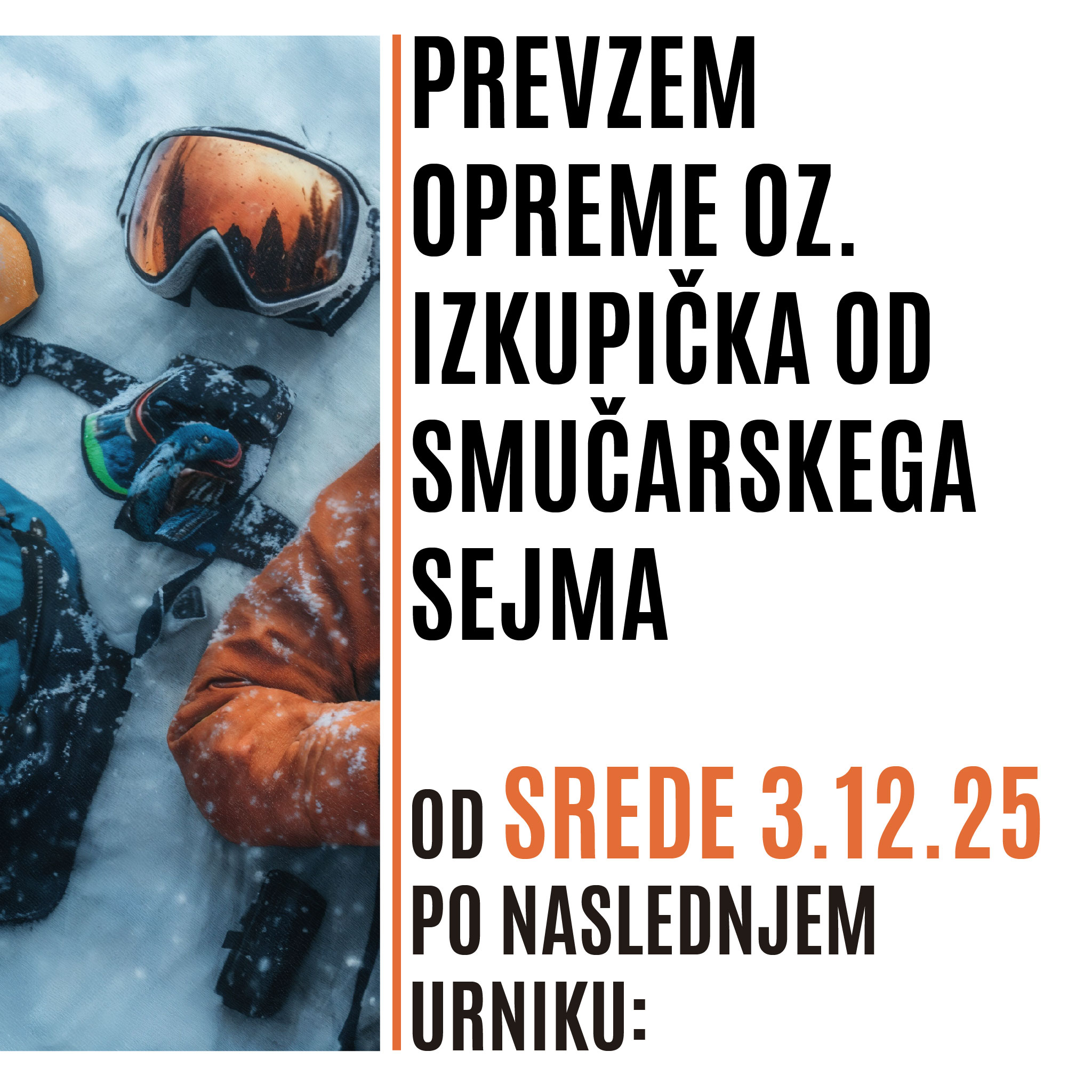 Opremo oziroma izkupiček od smučarskega sejma je mogoče od SREDE 3.12.25 dalje prevzeti na